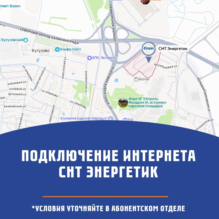 Компания Етайп предлагает подключение высокоскоростного интернета в СНТ Энергетик. Калининградской области. Мы специализируемся на обеспечении качественной связью частного сектора и загородных территорий Калининградской области, где применение стандартных проводных технологий затруднено или экономически нецелесообразно. Осознавая растущую потребность в надежном интернет-канале для удаленной работы, дистанционного обучения и современного досуга, наша команда разработала и внедрила эффективную сетевую инфраструктуру, адаптированную к локальным условиям. Наш опыт и техническая база позволяют гарантировать уверенный прием сигнала на всей территории СНТ «Энергетик».