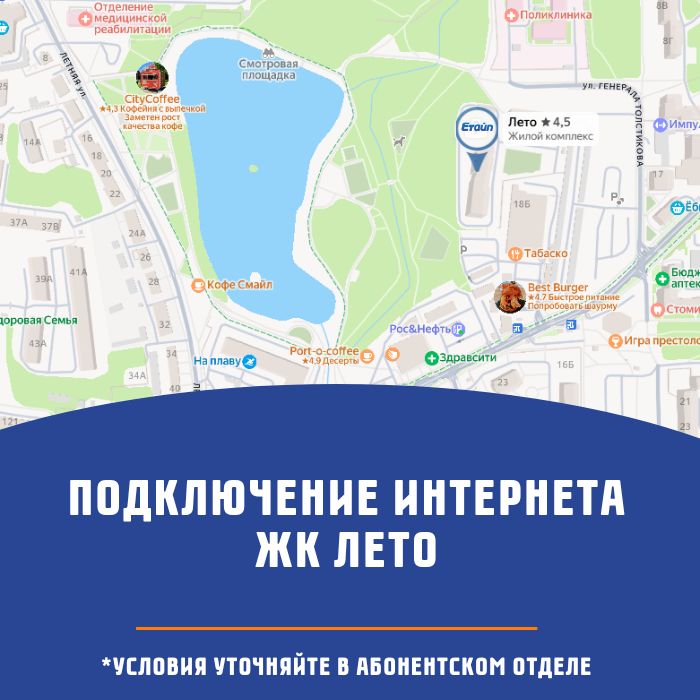 Компания Етайп предлагает жителям жилого комплекса «Лето» стабильное высокоскоростное подключение к интернету, полностью соответствующее запросам современной жизни рядом с природой и городом. ЖК «Лето» расположен в Московском районе Калининграда на улице Автомобильная, непосредственно у благоустроенного Летнего озера. Комплекс состоит из нескольких монолитно-каркасных корпусов переменной этажности комфорт-класса с продуманными планировками, закрытой территорией, детскими и спортивными площадками, прогулочными зонами вдоль воды, подземным и гостевым паркингом, где качественный и бесперебойный доступ в сеть обеспечивает удалённую работу, полноценное онлайн-обучение детей и комфортный семейный отдых с видом на озеро.